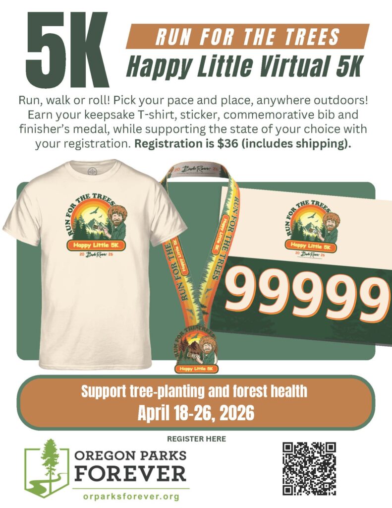 Oregon Parks Forever has joined a virtual 5K race, inspired by American painter and PBS television personality Bob Ross’ love of the outdoors, to help plant trees in parks & forests. Registration is now open for the 2025 Run for the Trees / Happy Little (Virtual) 5K.